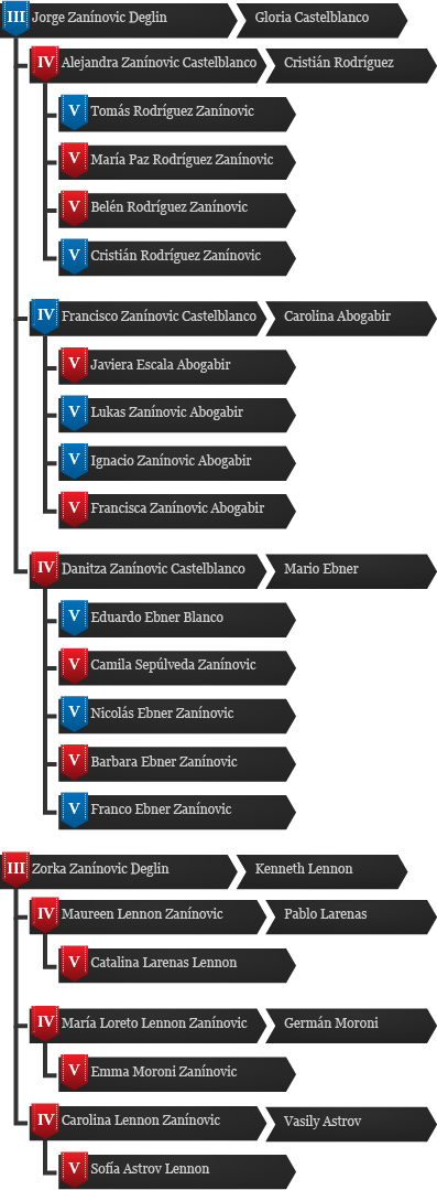 Jorge se recibió de Ingeniero Civil realizando variados trabajos: primero como empleado y luego como empresario en el rubro inmobiliario. De su matrimonio con Gloria, nacieron Alejandra, médico; Francisco egresado de derecho; y Danitza, psicóloga. Zorka en tanto es profesora de inglés y tuvo de su matrimonio con Keneth Lennon 3 hijas: Maureen, periodista; Loreto, médico, y Carolina, ingeniero comercial.